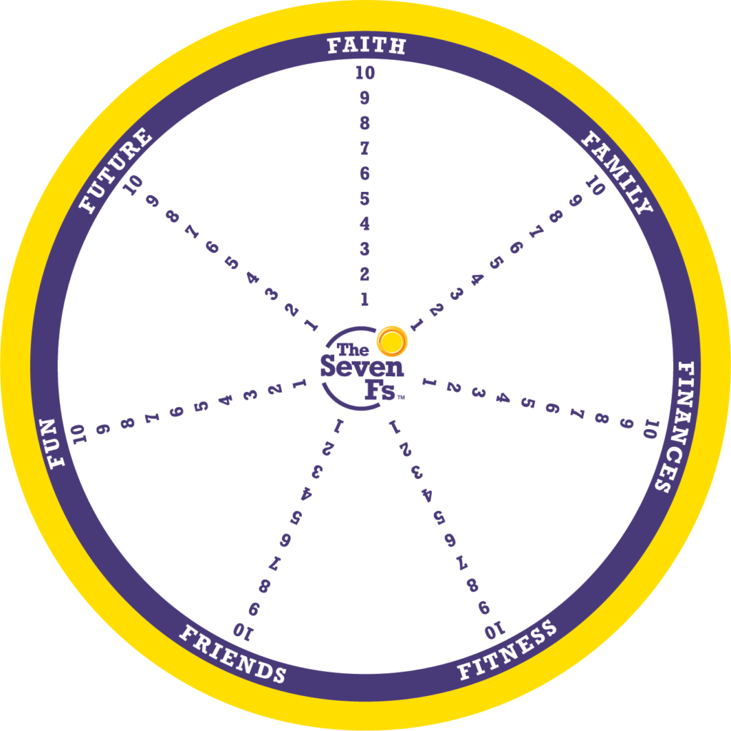 The seven spokes on the wheel form a simple self-assessment exercise to gauge your personal satisfaction and motivate self-improvement.