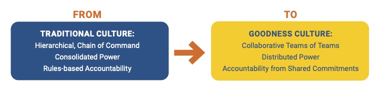 Accountability has gotten softer and more elusive. The rapid expansion of work from home positions, or the “hybrid” workplace has accelerated the switch from the Traditional Culture to the Goodness Culture. In the Traditional model, accountability was compliance and rules-based, with a sense of obligation to “my boss.” In the Goodness Culture, accountability comes from Negotiating Shared Commitments, and a sense of obligation “my colleagues.”
