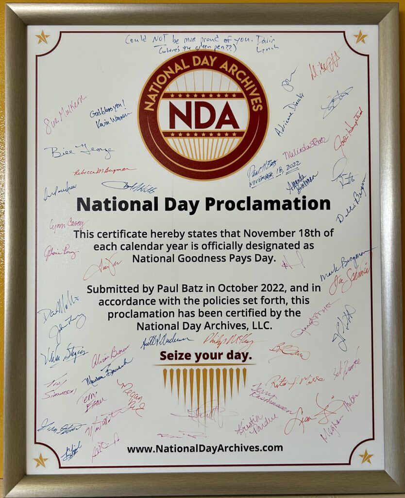 On Saturday, November 18, the Good Leadership team will share a LinkedIn post about something special: November 18, will be forever known as National Goodness Pays Day. Here’s how that came to be:
